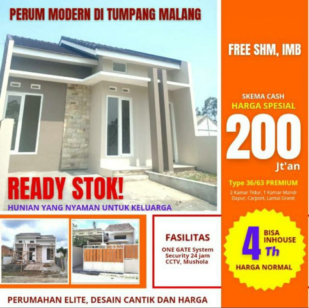 MODERN TUMPANG PROMO 175JUTA TYPE 32 LUAS TANAH 60 KAMAR TIDUR 2 KAMAR MANDI 1 Harga 200