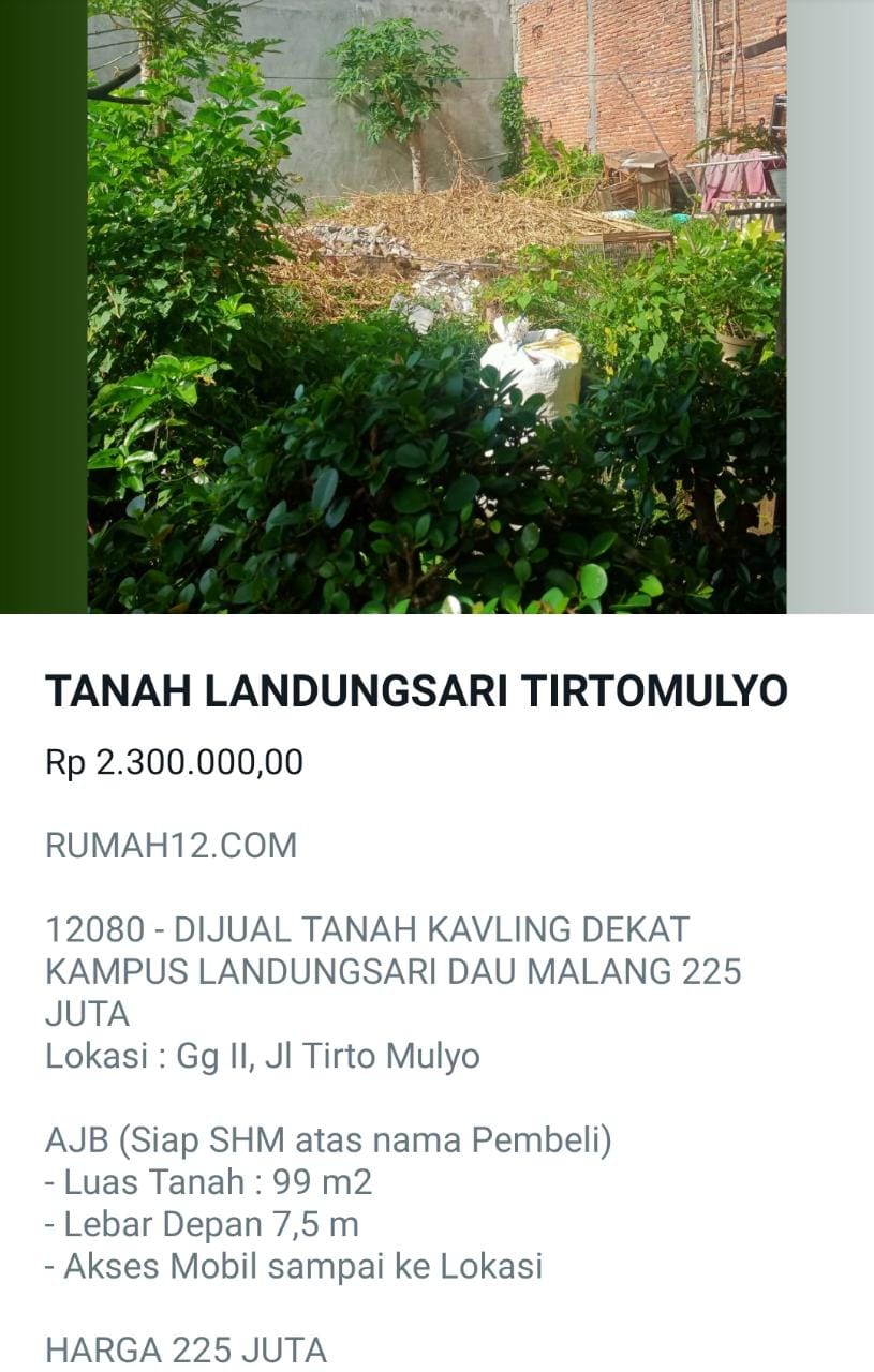 Dijual Tanah Kavling Dekat Kampus Landungsari Dau Malang