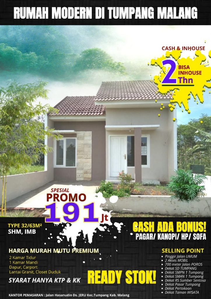 Dijual Rumah Modern di Tumpang Harga PROMO rp 135 JUTA TINGGAL 1 UNIT SAJA Type 27/60 m JANGAN LEWATKAN